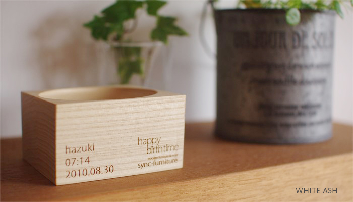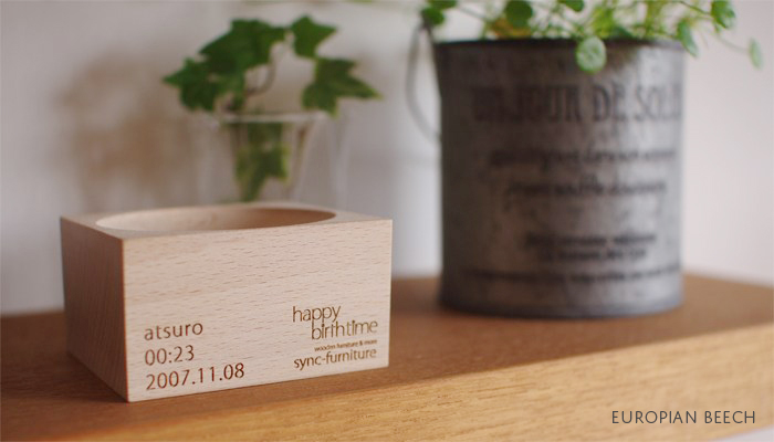 底面に、お名前、誕生時間、誕生日をレーザーにて刻印いたします。オプションで体重刻印も追加可能です(+ 550yen)