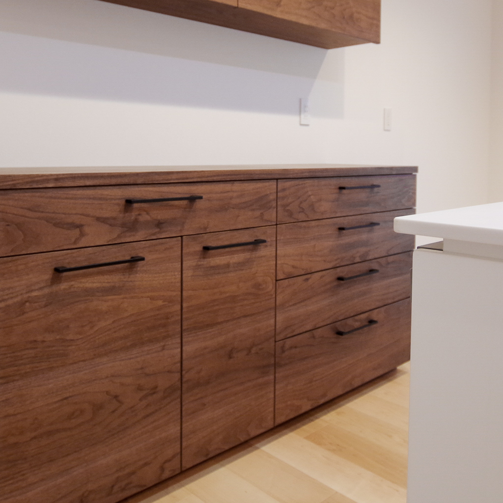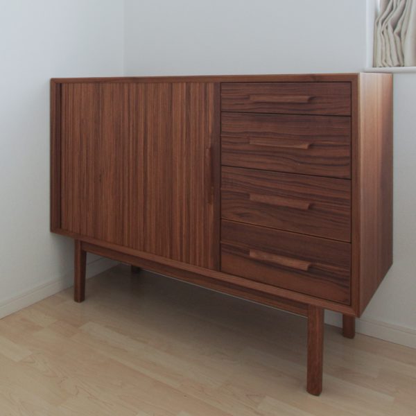 チークのブックマッチ貼りに真鍮のツマミが印象的なダイニングボード。