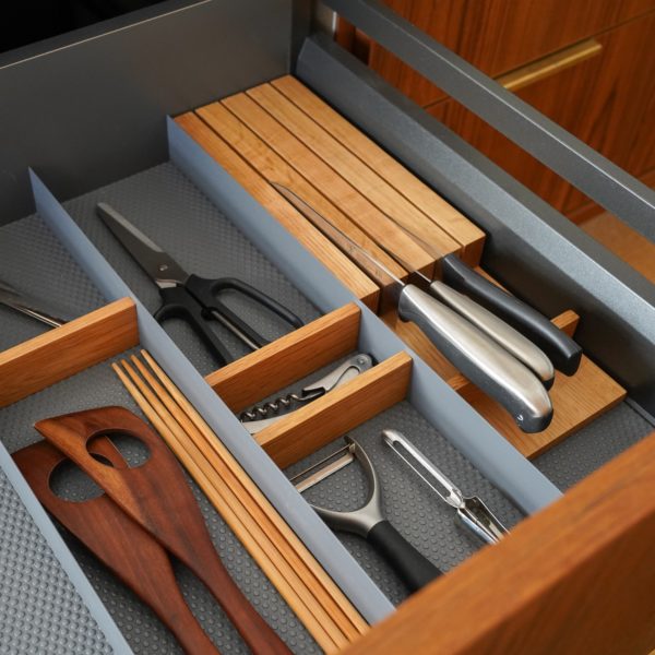 突板や無垢材を使用した、意匠性の高い木製引き出し。
